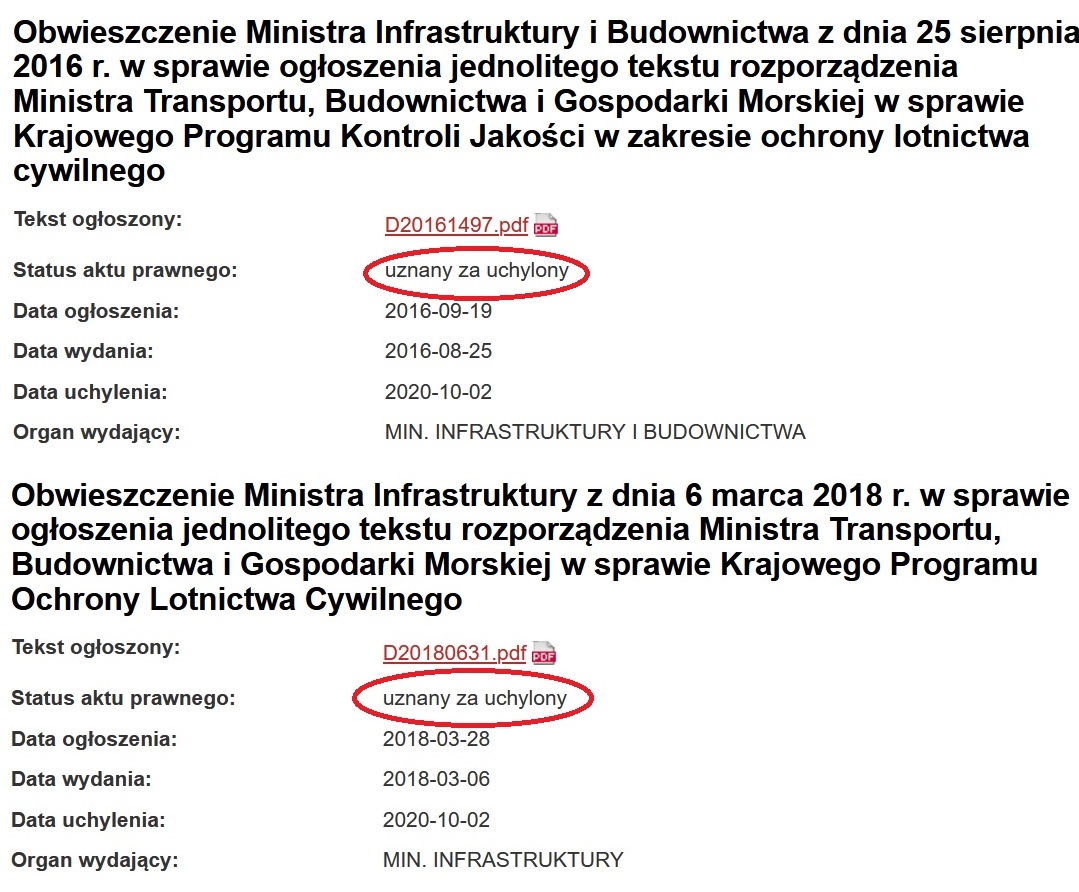Informuję, iż z dniem 1 października 2020 r. przestało obowiązywać rozporządzenie Ministra Transportu, Budownictwa i Gospodarki Morskiej z dnia 25 lipca 2013 r. w sprawie Krajowego Programu Kontroli Jakości w zakresie ochrony lotnictwa cywilnego (Dz. U. z 2016 poz. 1497) oraz rozporządzenie Ministra Transportu, Budownictwa i Gospodarki Morskiej z dnia 31 lipca 2012 r. w sprawie Krajowego Programu Ochrony Lotnictwa Cywilnego (Dz.U. z 2018 r. poz. 631).