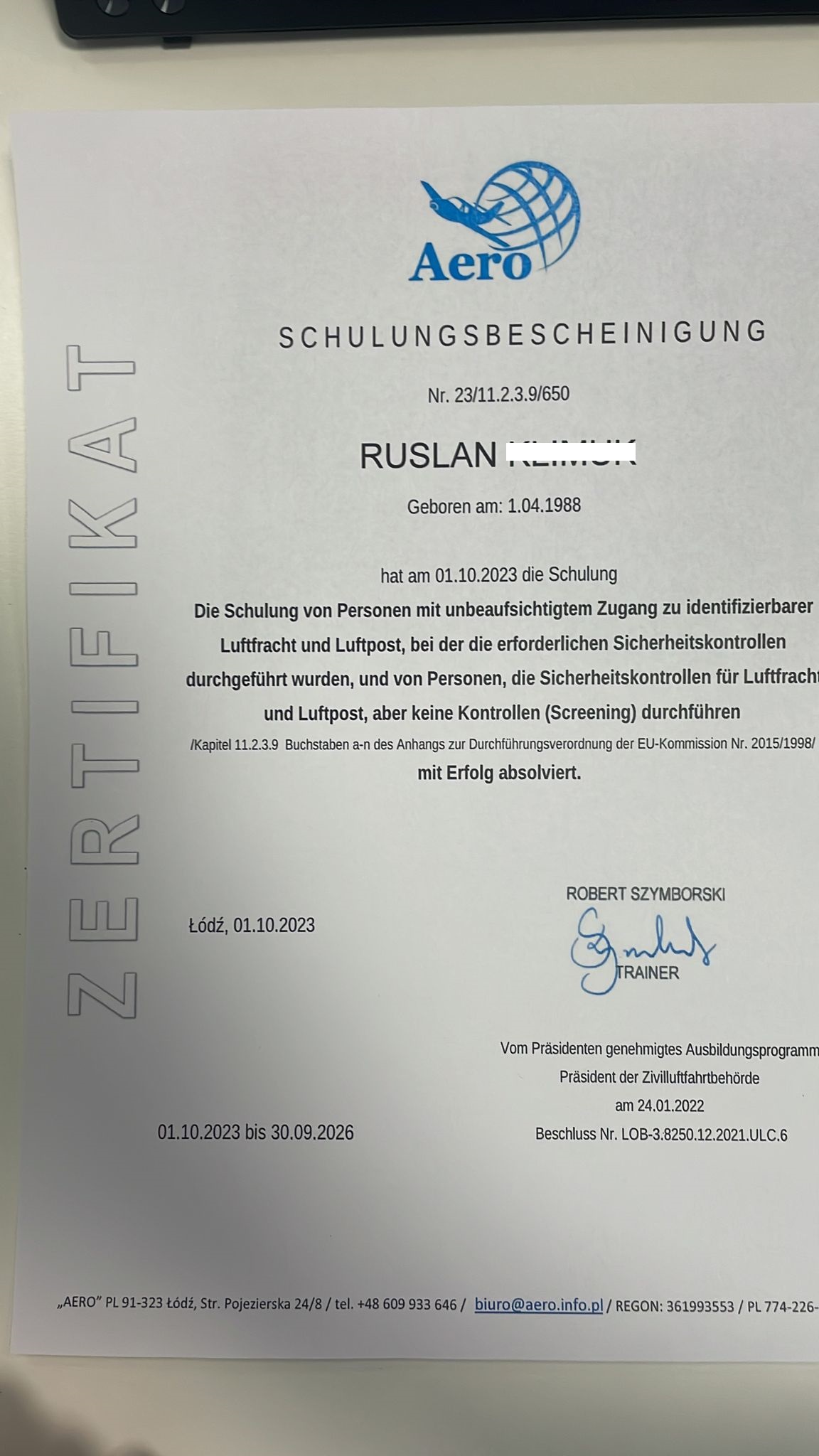 W dniu 25.07.2024 po godzinie 19.00 otrzymaliśmy informację o próbie posłużenia się podrobionym certyfikatem AERO.
