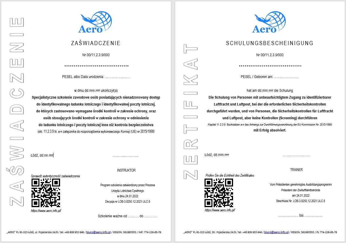 Przypominam i informuję, iż każdy certyfikat wystawiony przez firmę AERO od 01.01.2022 posiada indywidualny kod QR. Kod ma na celu umożliwienie w szybki sposób kontroli dokumentu w zakresie daty ważności oraz dla kogo został wystawiony.